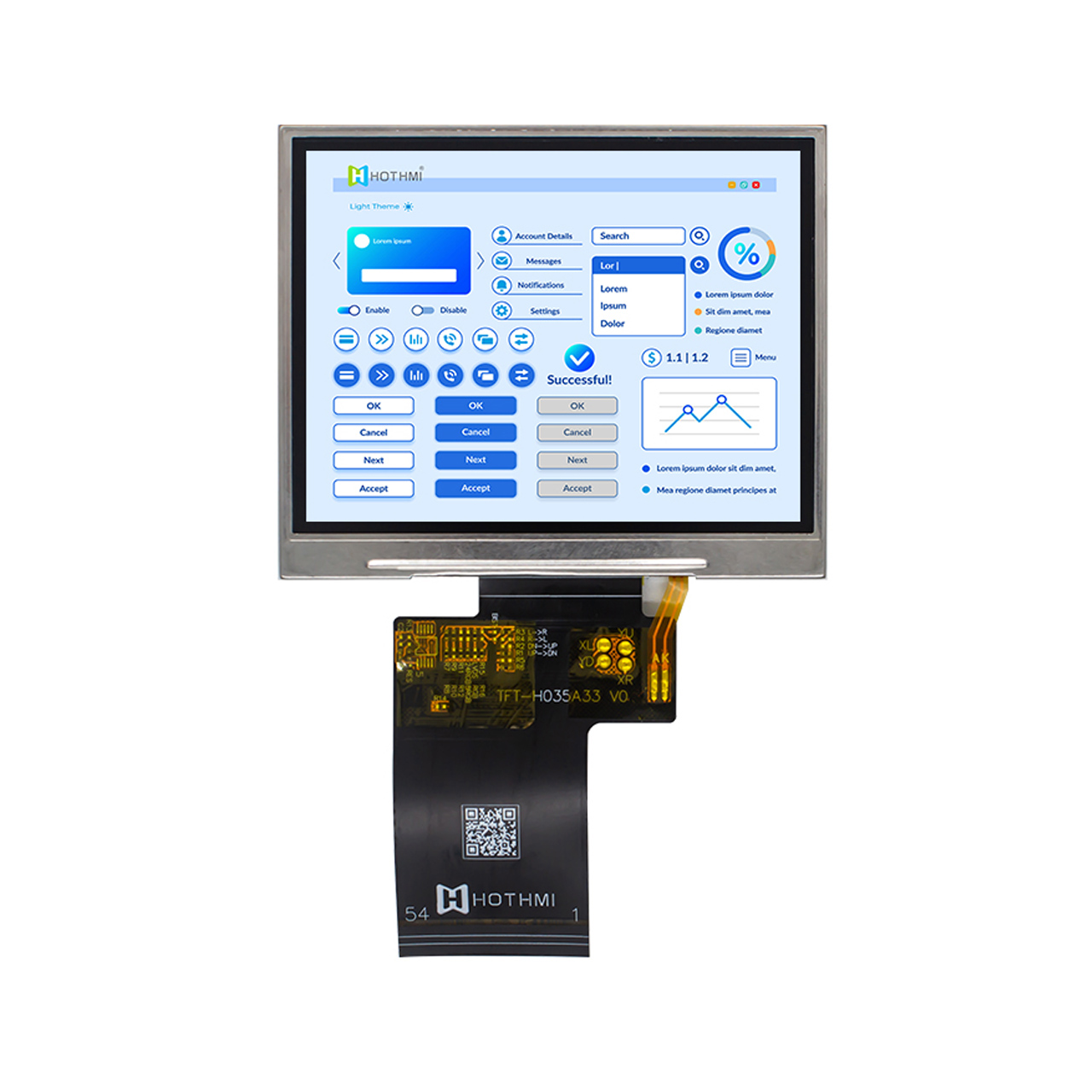 This 3.5-inch TFT LCD display offers a 320x240 pixel resolution, delivering crisp and detailed images, making it ideal for displaying critical data and user interfaces on outdoor equipment and central control systems. Its compact size allows for seamless integration into space-constrained designs. A standard 54-pin RGB interface ensures convenient connectivity and compatibility. This 3.5-inch TFT LCD boasts exceptional durability and visual performance, making it an outstanding and reliable choice for developers seeking a monitor that won't fail at critical moments.