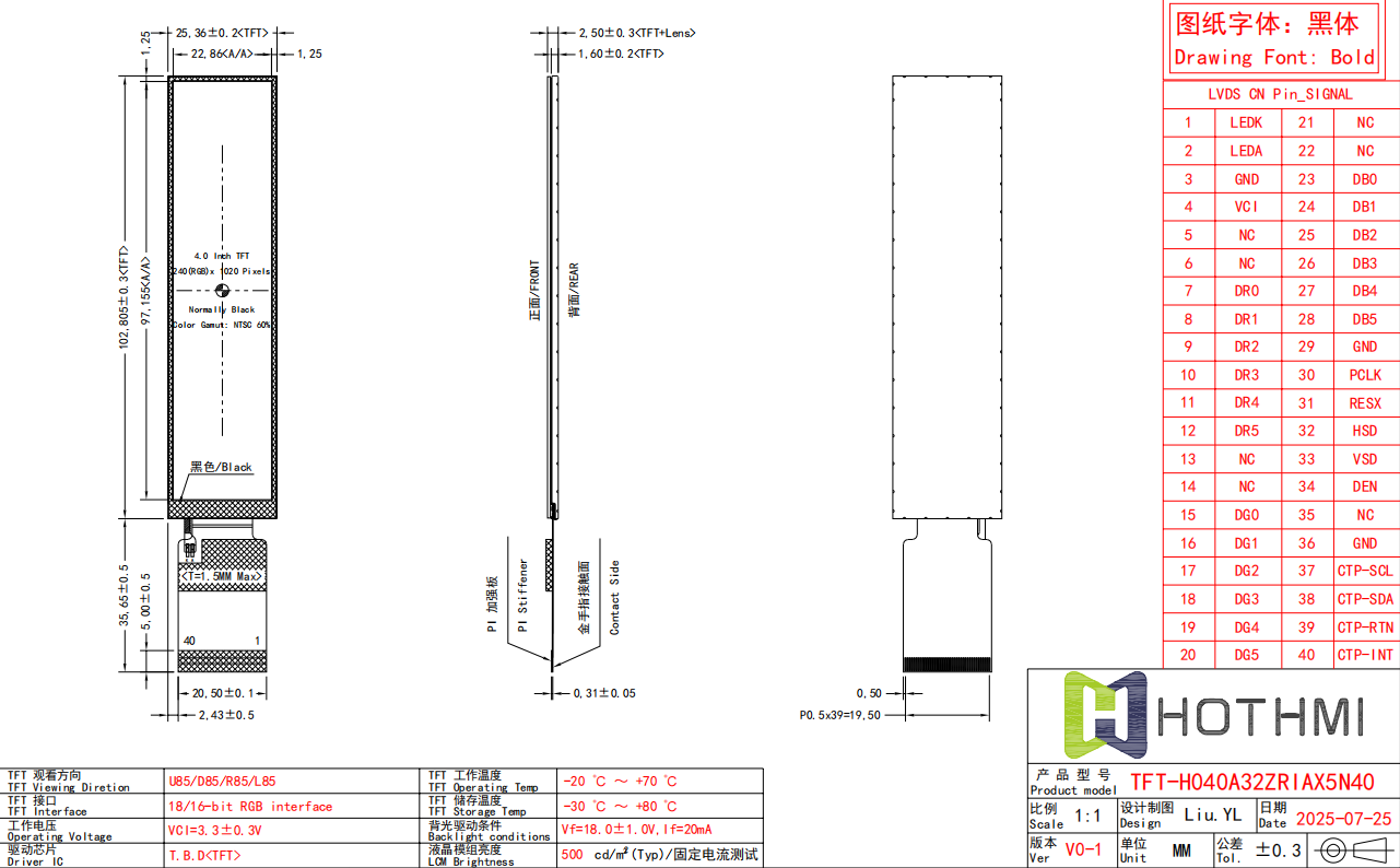 25.36x102.805x2.5 | 4.0 | 4.0 | 22.86x97.155 | IPS | 500cd/m2 | 40 PIN | RGB | Anti-static ESD 8KV | -20~70℃ | +3.3V | ||