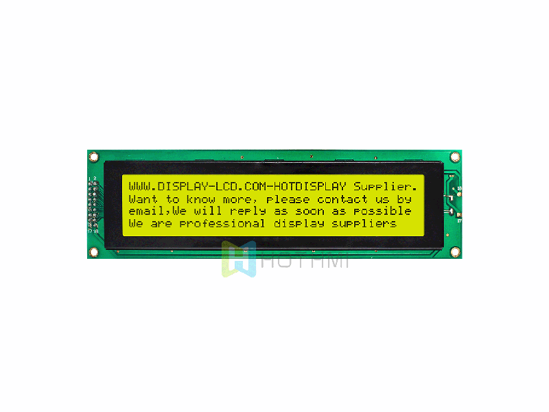 HOTDISPLAY offers a wide range of standard Character LCD modules for customers' application. Our LCD character displays are available from 8x2, 12x2, 16x1, 16x2, 16x4, 20x2, 20x4, 24x2 through to 40x4 formats with 5x8 dot matrix characters. The LCD panel technologies include TN, STN, FSTN, FFSTN types and also with polarizer positive mode and negative mode options. There are different LED backlights are available in various colors including yellow/green, white, red, blue, green, amber, and RGB LEDs as well as no backlight option.