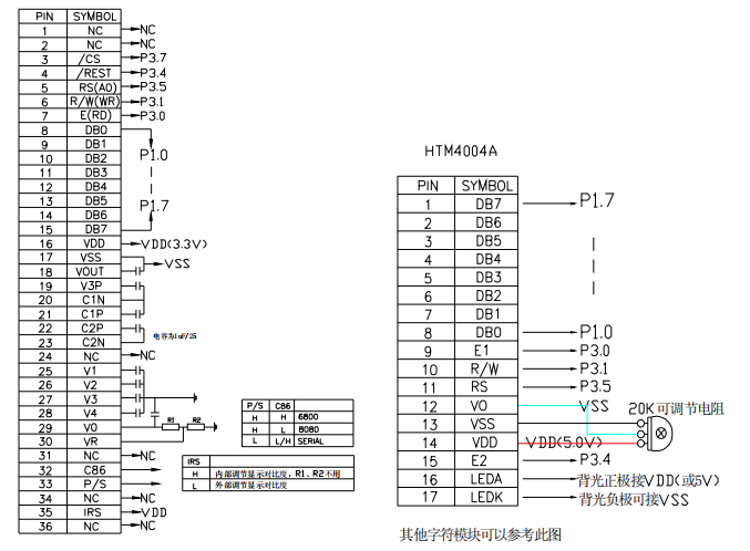 IRS:此腳為選擇用內(nèi)部調(diào)節(jié)還是外部調(diào)節(jié)顯示對比度。低電平選外部調(diào)節(jié);高電平選擇外部調(diào)節(jié);