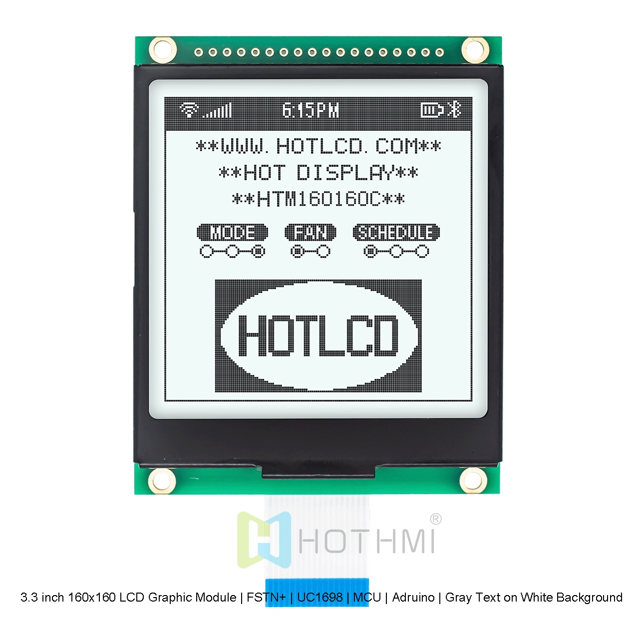3.3 英寸 160x160 LCD 圖形模塊在白色背景上顯示深灰像素。這款透射式 LCD 顯示屏經(jīng)過精心設(shè)計,可在較暗的環(huán)境下使用時提供最佳的可視性和令人印象深刻的色彩。顯示屏內(nèi)置強(qiáng)背光,可提供高對比度并確保屏幕上所有圖形的易讀性。