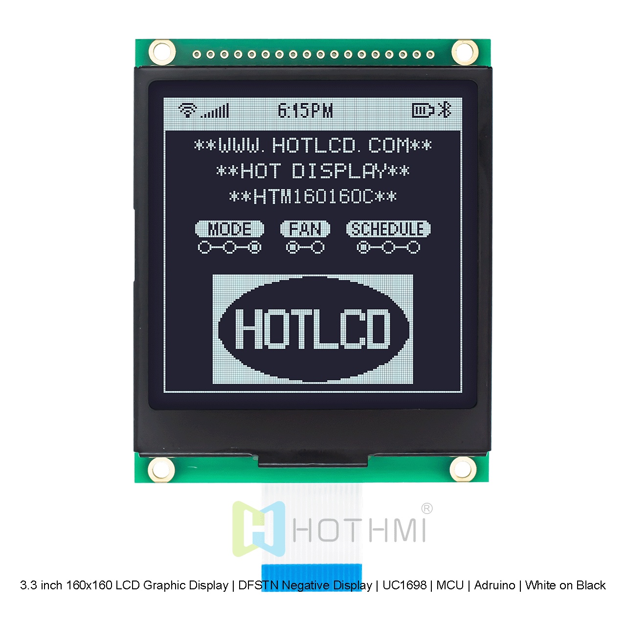 3.3 英寸 160x160 LCD 圖形顯示屏在黑色背景上顯示白色像素。這款全透式 LCD 顯示屏經過精心設計,在明亮環(huán)境中,通過偏光片的反射性,將圖像反射給觀賞者,在較暗的環(huán)境中,LCD 內置強背光,可提供高對比度并向觀看者顯示清晰的圖形。這種先進的顯示技術可確保顯示屏始終易于閱讀,無論照明條件如何。