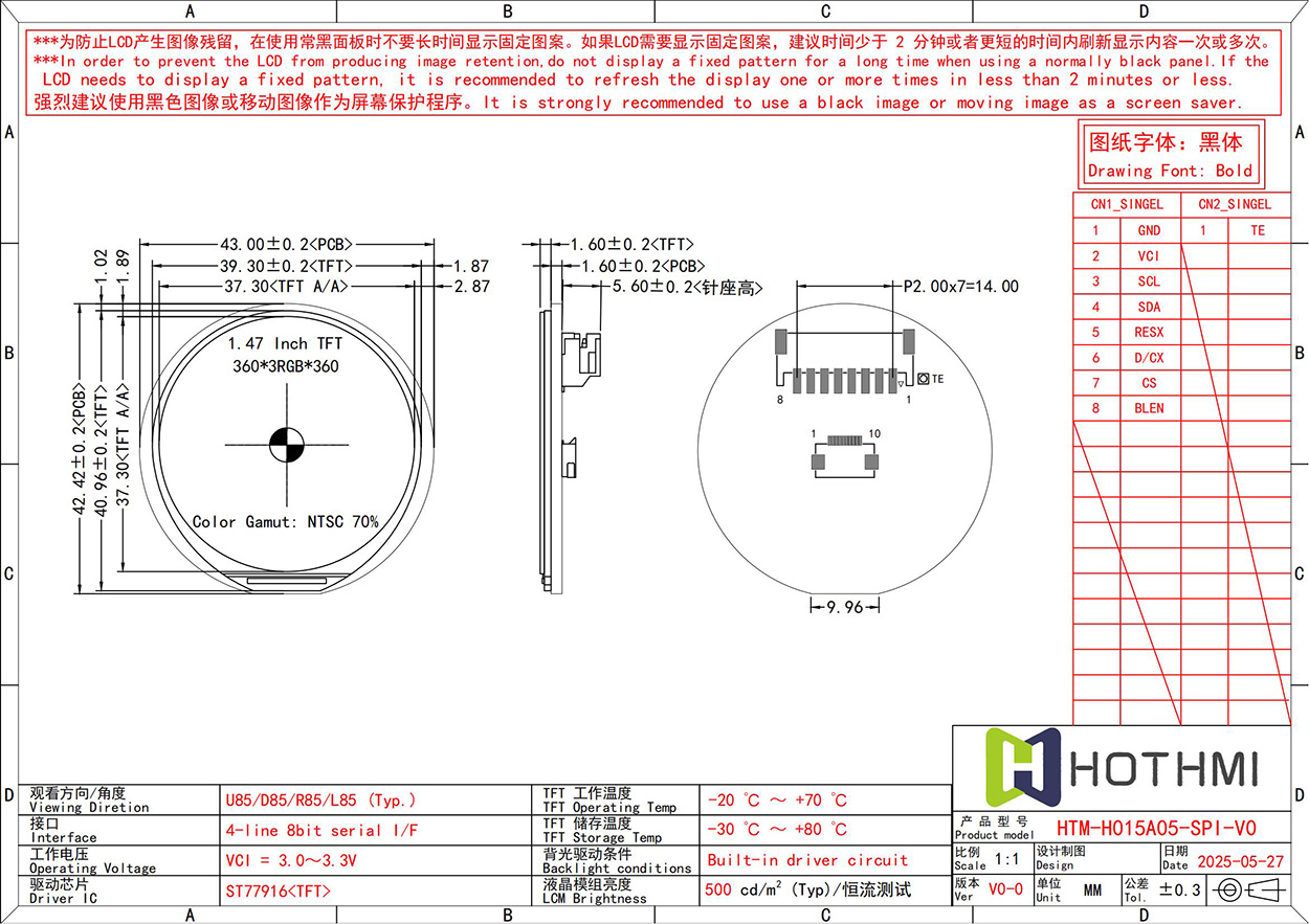 這款1.5英寸圓形TFT模塊卓越的工業(yè)級可靠性令人矚目:工作溫度橫跨-20℃至+70℃,存儲溫度更可耐受-30℃至+80℃嚴(yán)苛環(huán)境。高達500 cd/m2的典型亮度(恒流測試),確保強光環(huán)境下畫面依然清晰銳利。模塊特別優(yōu)化動態(tài)顯示性能,建議搭配黑色或動態(tài)屏保使用,避免固定圖案長時間停留超過2分鐘,有效預(yù)防圖像殘留,延長屏幕壽命。