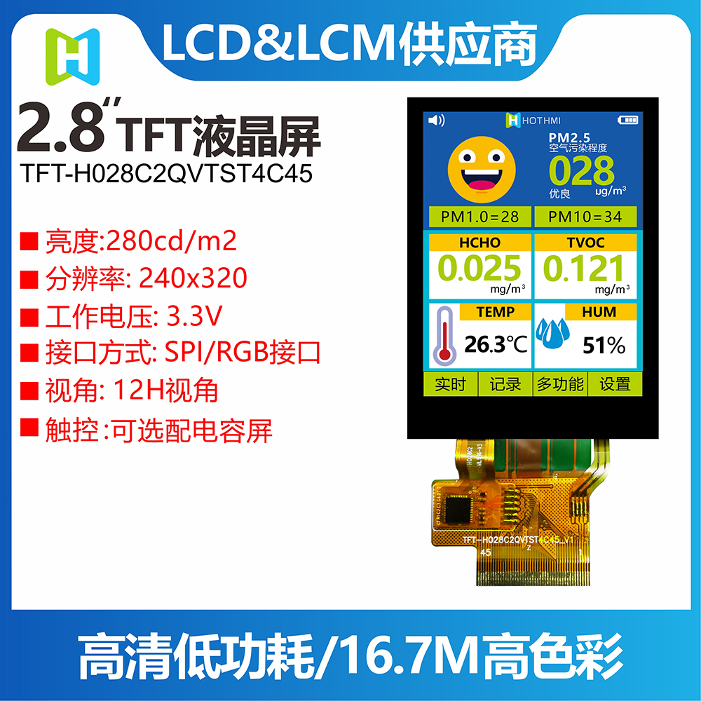 2.8寸TFT彩屏 /240*320分辨率 /12H White LED /RGB/SPI/MCU接口 /TFT-H028C2QVTST2C45/應(yīng)用于手持儀器儀表