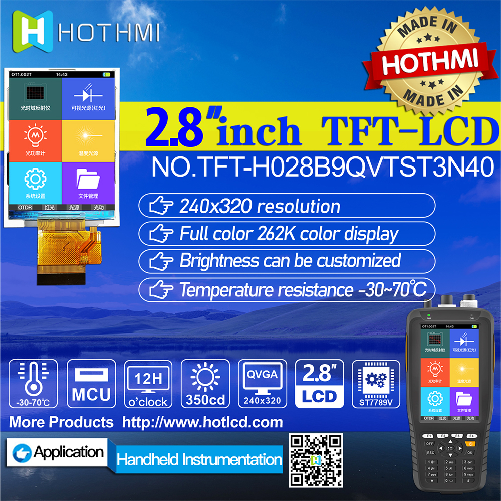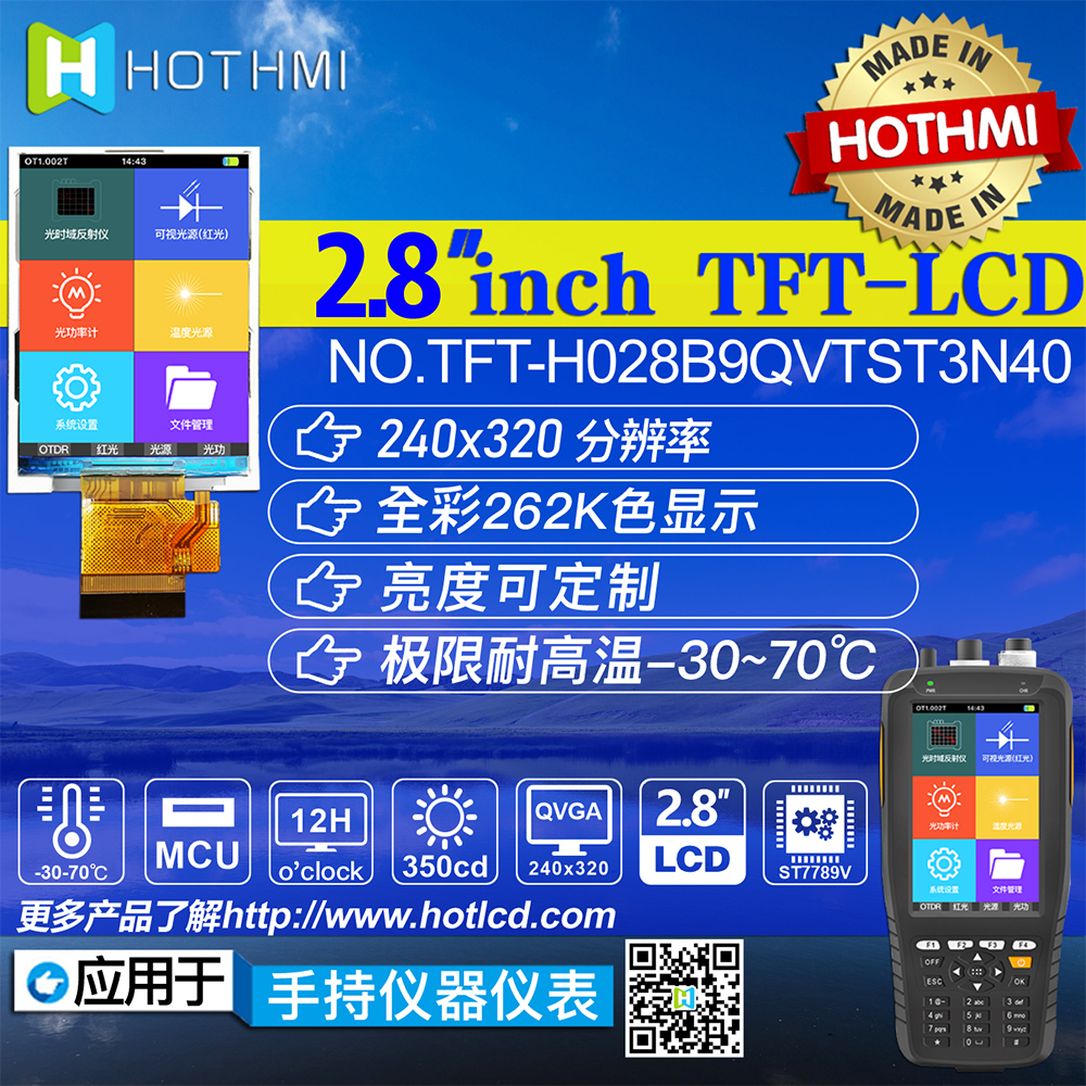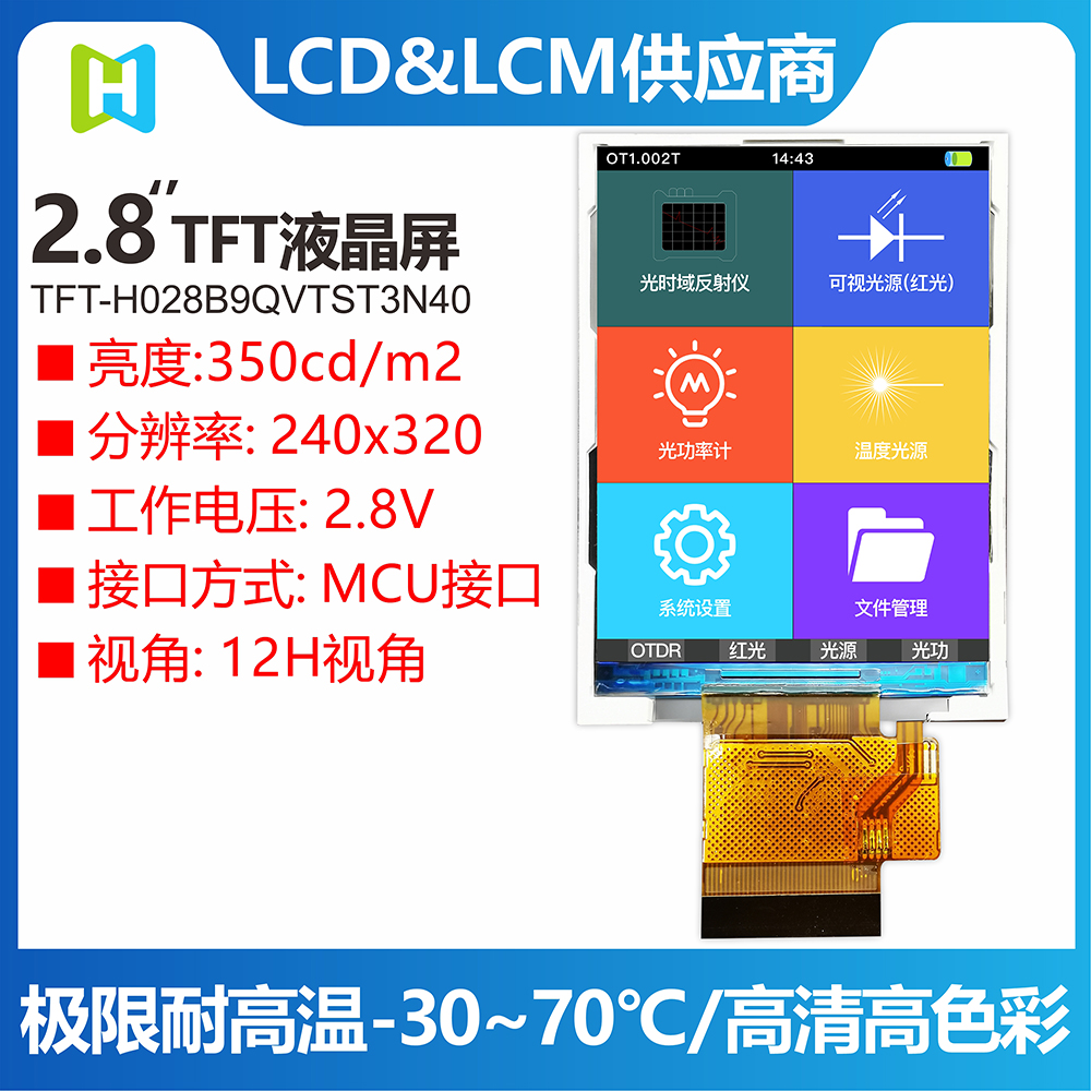 TFT-H028B9QVTST3N40是HOTLCD研發(fā)團隊精心設(shè)計的2.8英寸TFT彩色液晶屏,240*320分辨率,高畫質(zhì),廣視角,65K/262K真彩色,內(nèi)置ST7789V控制器,支持MCU接口,40PIN外掛FPC可以接主板(可選接頭),單電源DC 2.8V供電。 TFT 模塊可配備觸摸屏,所有材料均符合 RoHS 標準。 廣泛應用于各種儀表、智能設(shè)備、分析儀器、手持儀表、行車記錄儀等:8051、PIC、AVR、ARDUINO、ARM、樹莓派等。