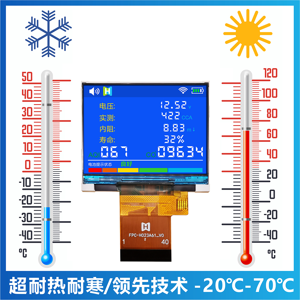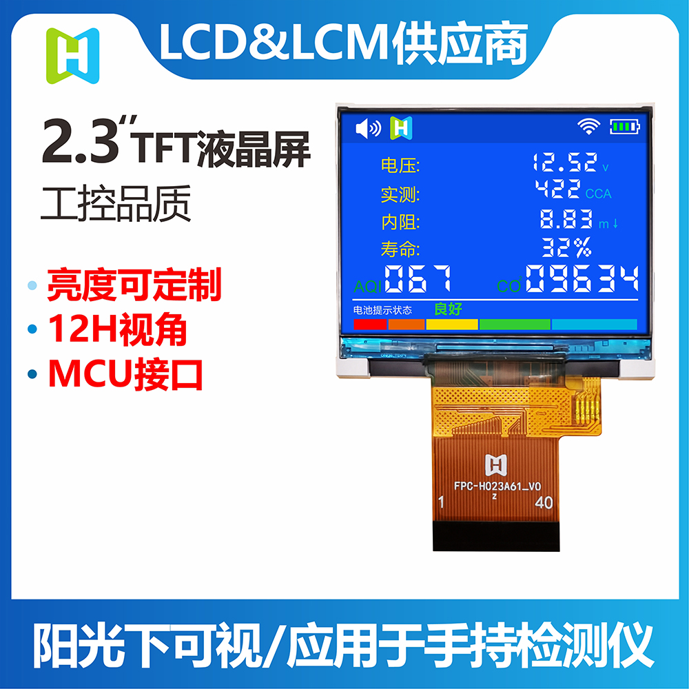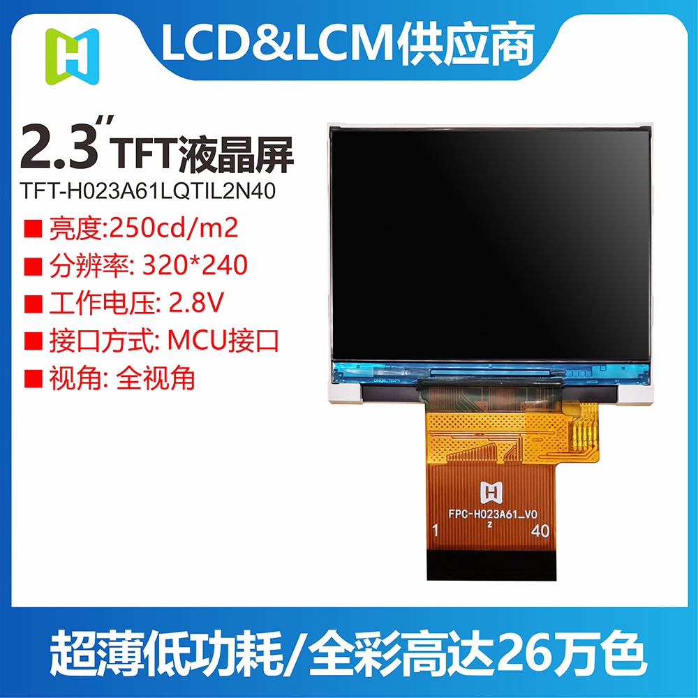 TFT-H023A61LQTIL2N40是一款工業(yè)級橫屏顯示的 TFT LCD液晶屏,分辨率為320*240像素,液晶屏typical 亮度為400 nits,視角為12H方向;供電電壓(VCI)為2.8V~3.2V,typical 值為2.8V。工作溫度為-20℃~+70℃,儲存溫度為-30℃~+80℃。產(chǎn)品使用于各項(xiàng)小型智能設(shè)備,家電,監(jiān)控器等。