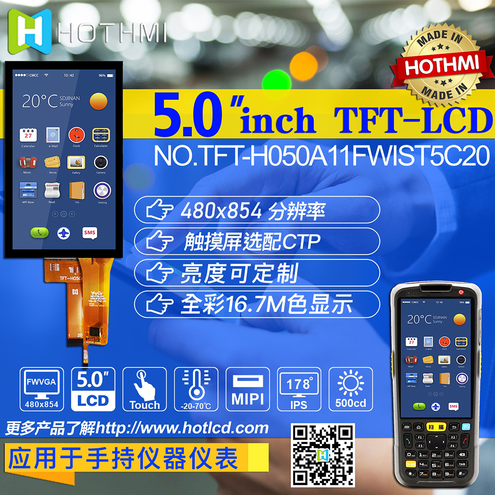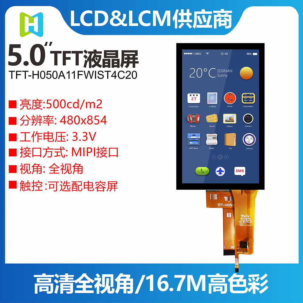 TFT-H050A11FWIST4C20 是一款 5.0 英寸寬溫 IPS TFT-LCD 顯示器,帶有投射電容式觸摸屏,分辨率為 480x854 像素。 模塊內(nèi)置ST7701驅(qū)動(dòng)IC,支持MIPI接口。 TFT-H050A11FWIST4C20采用IPS面板,具有視角更廣的優(yōu)勢(shì),左:80/右:80/上:80/下:80度(典型),對(duì)比度800:1(典型),亮度500尼特(典型) ) 值),眩光面板,16:9 縱橫比。 觸摸屏內(nèi)置GT911 IC,支持I2C接口和多點(diǎn)觸控功能。 H050A11 型號(hào)具有投射電容式觸控面板 (PCAP),但沒(méi)有觸控面板選項(xiàng) (TFT-H050A11FWIST5N20)。 TFT-H050A11FWIST4C20的供電電壓(VCC)為3.0V至3.6V,典型值為3.3V。 它可以在 -20°C 到 +70°C 的溫度和 -30°C 到 +80°C 的存儲(chǔ)溫度下工作。
