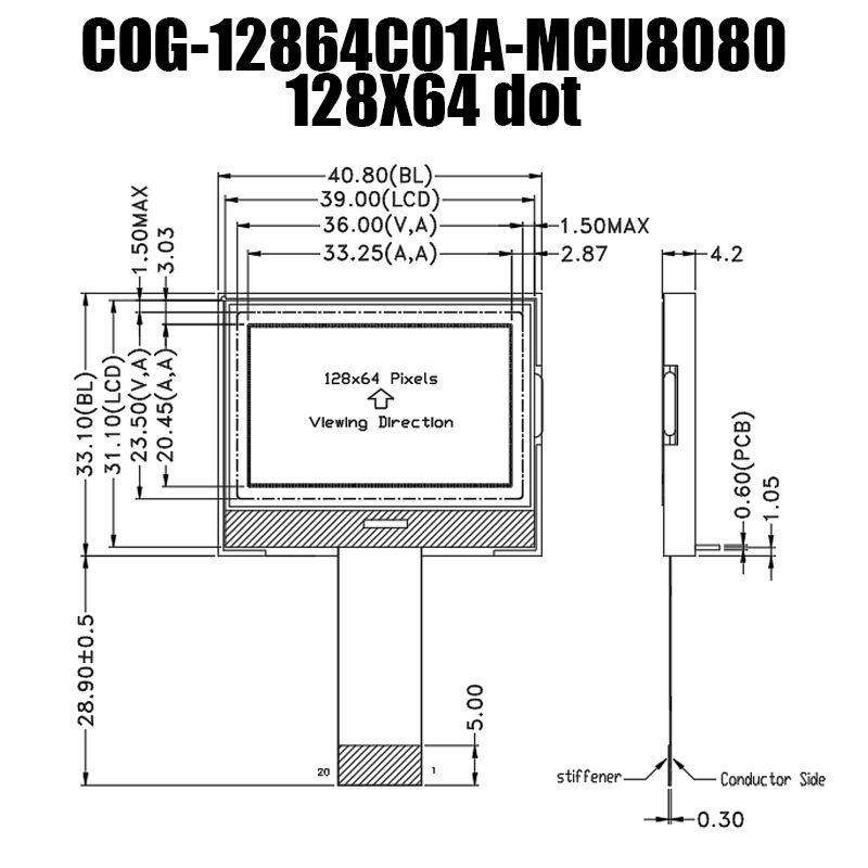 該顯示模塊的外形尺寸為40.8x33.1x4.2毫米,視域窗口尺寸為36.0x23.5毫米,顯示尺寸為33.25x20.45毫米,為您提供清晰而寬廣的視野。它具有128x64的顯示內(nèi)容,能夠顯示豐富的圖形和信息。