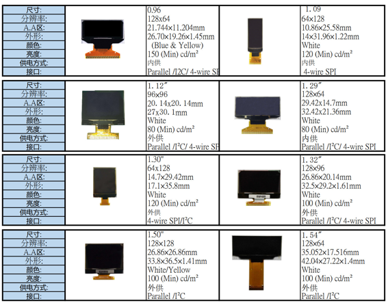 1.32寸OLED、1.50寸OLED、1.54寸OLED、2.23寸OLED、2.40寸OLED、2.42寸OLED、2.70寸OLED、3.12寸OLED