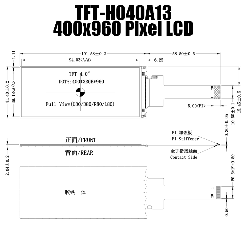 4.0寸長條形TFT 400x960分辨率 IPS全視角 高亮度 寬溫 TFT-H040A13ZDIST6N20