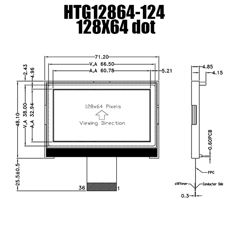 HTG12864-124 | 單色圖形COG | 128x64 點 | 透反式液晶顯示器 | 側面白色背光| FSTN(+)正極顯示