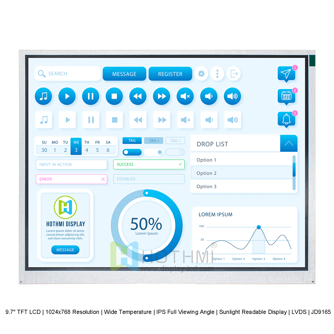 這款 9.7英寸的TFT LCD 分辨率為 1024x768,配備強(qiáng)大的背光,亮度為 500 cd/m2,在明亮的照明條件下(包括直射陽(yáng)光)提供可視性性。該液晶顯示器符合 RoHS 標(biāo)準(zhǔn),并與 Arduino 和其他類似板兼容。 一些行業(yè)和應(yīng)用包括工業(yè)、商業(yè)、控制、PLC、戶外手持設(shè)備、航空、消費(fèi)電子產(chǎn)品、醫(yī)療設(shè)備、汽車(chē)儀表板、信息亭、現(xiàn)場(chǎng)工程、農(nóng)業(yè)、戶外運(yùn)動(dòng)設(shè)備等等??刂破鲀?yōu)化了顯示器的功能,確保運(yùn)行流暢并準(zhǔn)確呈現(xiàn)圖像和圖形。