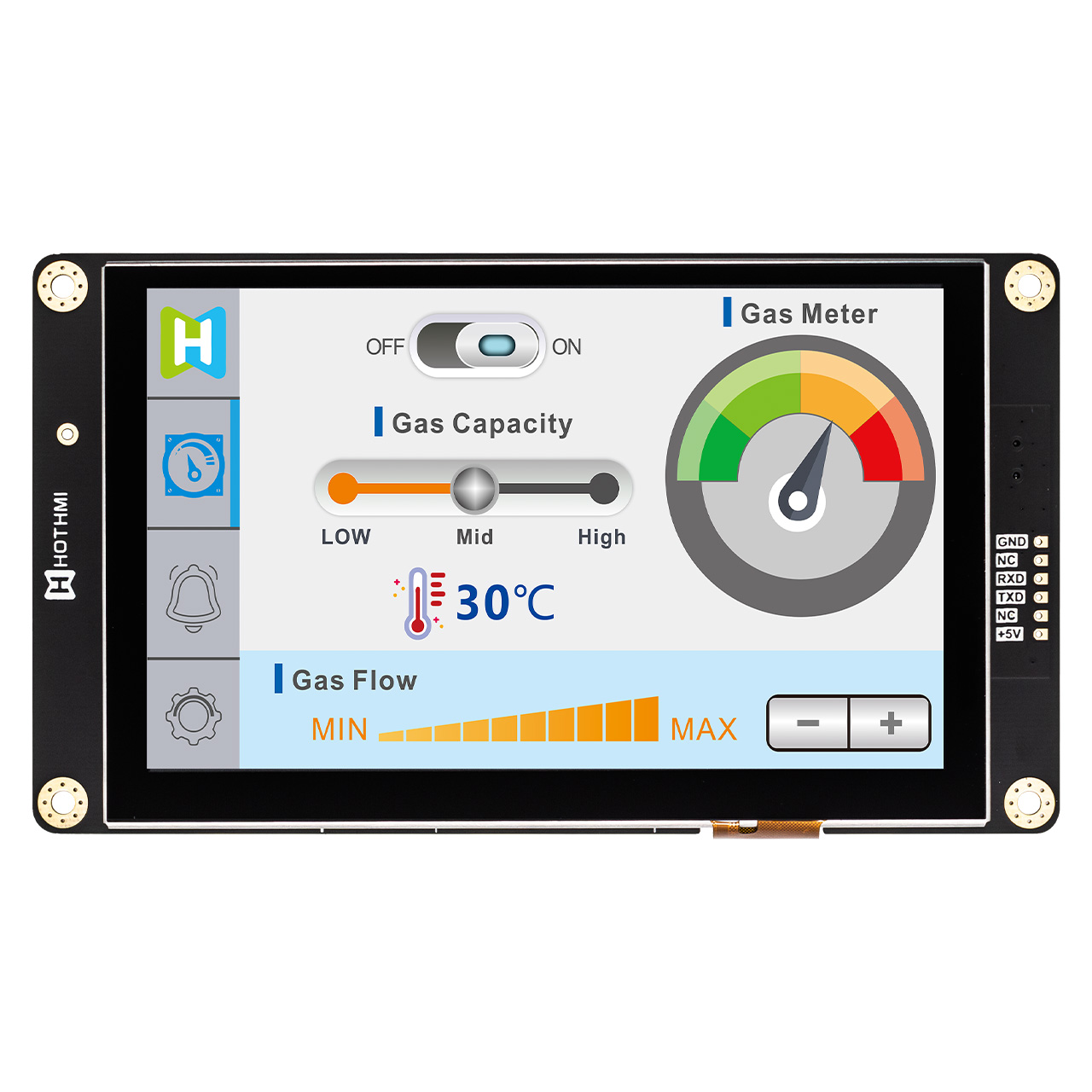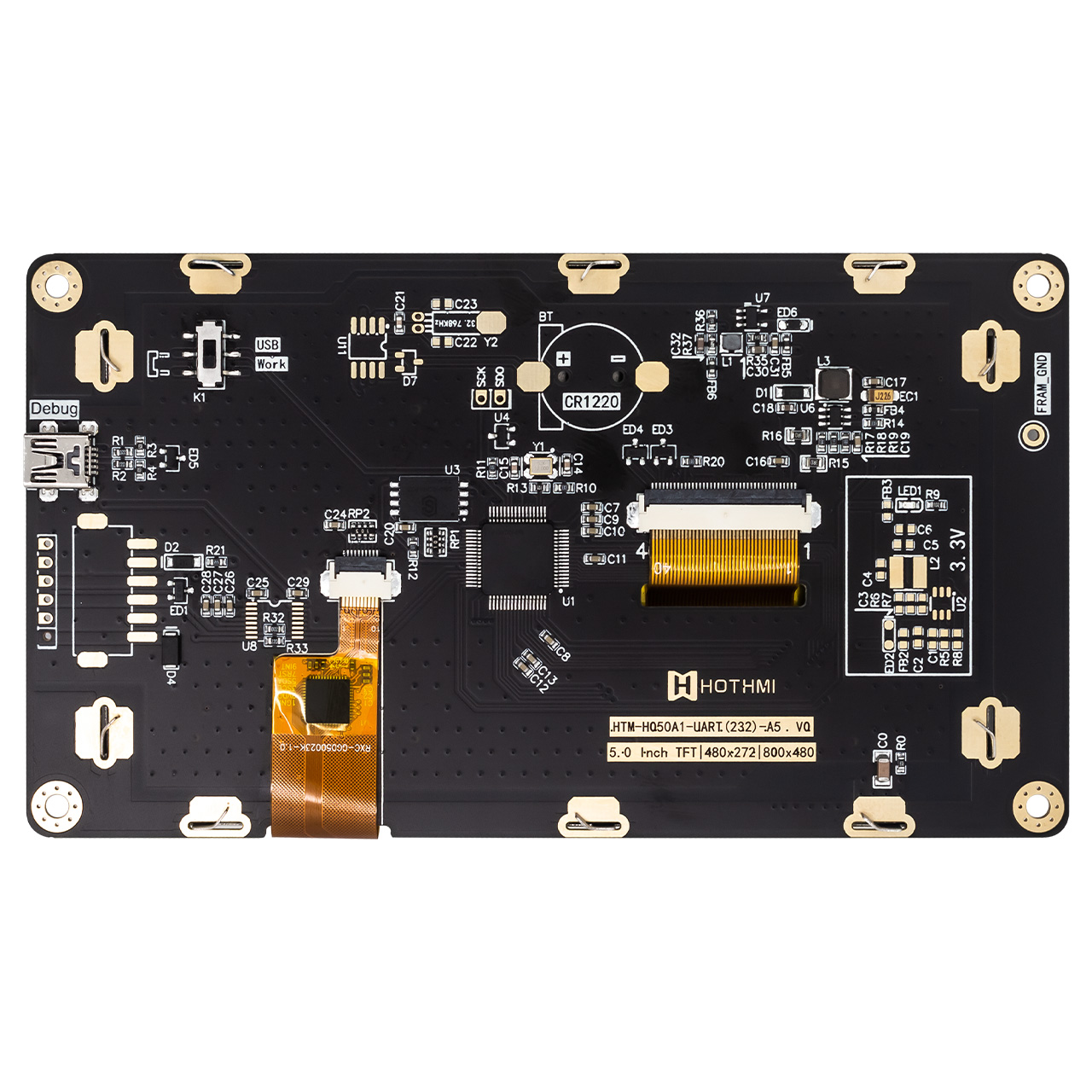 HTM-H050A1-UART-A5C是一款 5.0英寸 IPS TFT 顯示模組,分辨率為 800x480 像素。它是一款帶有智能顯示功能的顯示屏,有UART接口,人機(jī)信息交換功能。除了控制器之外,我們的 HMI 顯示器還集成了 MCU 功能。MCU 通過 UART 接口接收主控制板(客戶端)發(fā)送的命令,然后根據(jù)這些預(yù)定義的指令顯示文本、圖像或動(dòng)畫。主控制板(客戶端)上的 MCU 不需要專門針對圖像顯示的復(fù)雜編程或執(zhí)行。您可以使用我們的 GUI 設(shè)計(jì)軟件 - UI 編輯器輕松創(chuàng)建文本、圖像或動(dòng)畫。無需編程技能。這款型號(hào)同時(shí)配置了電容式觸摸,多點(diǎn)觸控,順暢無阻。