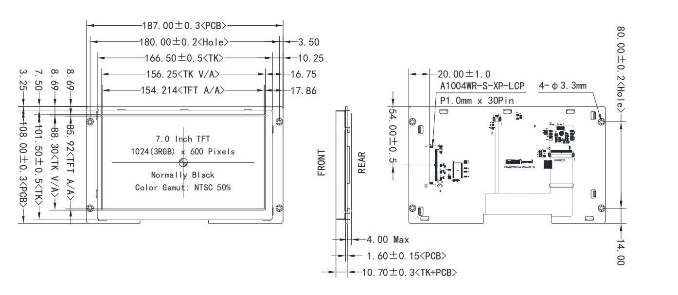 187.0x108.0x12.6 | 154.214x85.92 | 7.0 | IPS全視角 | 800cd/m2 | FPC-30pin | LVDS | 8KV 防靜電 (ESD) | -20~70℃ | +3.3V |
