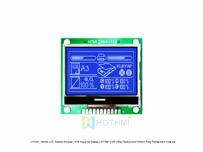 | 2.0 英寸 128X64 LCD 圖形液晶模塊/STN 負顯/ST7567/SPI /藍底白字/全透偏光片 HTM12864-112-25W-A5P | 圖形液晶模組 | 128x64 |